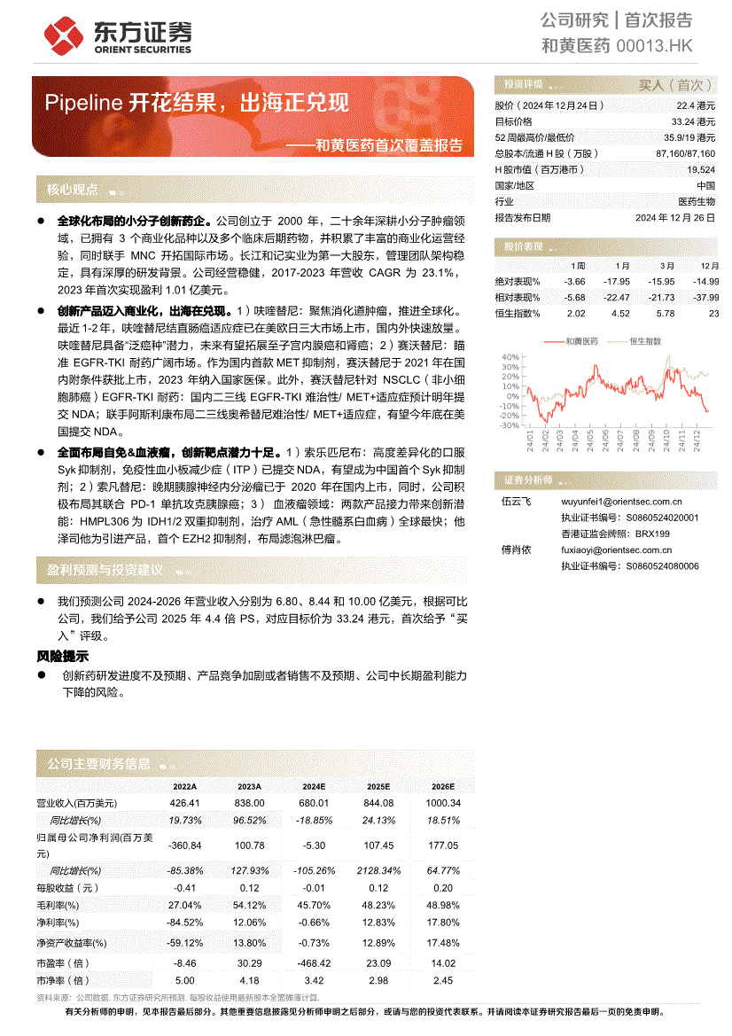 表2:公司在研管线月) 研究用药靶点适应症目标人群研究名称国家/地区研发进展呋喹替尼VEGFR1/2/3结直肠癌难治性FRESCO-2全球2023年美国、2024年欧盟及日本上市三线或以上;化FRESCO中国2018年上市8.38 3.06 -50% -20% 10% 40% 70% 100% 0 2 4 6 8 10 1.01 0.26 -200% -100% 0% 100% 200% -4 -3 -2 -1 0 1 2和黄医药首次报告—— Pipeline开花结果,出海正兑现8 疗难治性子宫内膜癌二线年上市肾细胞癌二线/中国临床试验赛沃替尼MET NSCLC MET外显子14跳跃突变/中国2021年上市NSCLC、胃癌、状肾细癌等/ /全球临床试验索凡替尼VEGFR1/2/3;FGFR-1;GSF-1R 胰腺神经内分泌瘤不限SANET-p中国2021年上市非胰腺神经内分泌瘤不限SANET-ep中国2020年上市胰腺导管腺癌转移性/中国II/III期索乐匹尼布Syk 原发免疫性血小板减少症复发性/难治性ESLIM-01中国上市申请ITP全球研究全球Ib期温抗体型自身免疫性溶血性贫血不限ESLIM-01中国III期HMPL-306 IDH1/2急性髓系白血病复发性/难治性RAPHAEL中国III期他泽司他EZH2 上皮样肉瘤、滤泡性淋巴瘤/ /中国2022年海南、2023年澳门、2024年香港上市滤泡性淋巴瘤、淋巴瘤/ /中国临床试验HMPL-760 BTK非霍奇金淋巴瘤复发性/难治性/中国临床I期HMPL-295 ERK;MAPK实体瘤/ /中国临床I期HMPL-653 CSF-1R实体瘤、腱鞘巨细胞瘤/ /中国临床I期HMPL-A83 CD47恶性肿瘤晚期/中国临床I期HMPL-415 SHP2实体瘤晚期恶性/中国临床I期HMPL-506 Menin血液恶性肿瘤/ /中国临床I期数据来源:公司官网,公司公告,东方证券研究所商业化运营经验丰富。